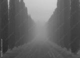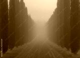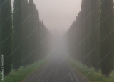 Cypress tree valley in the morning mist. Tuscany, Italy.