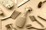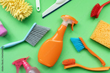 House cleaning plastic product on green table background, home service or housekeeping concept