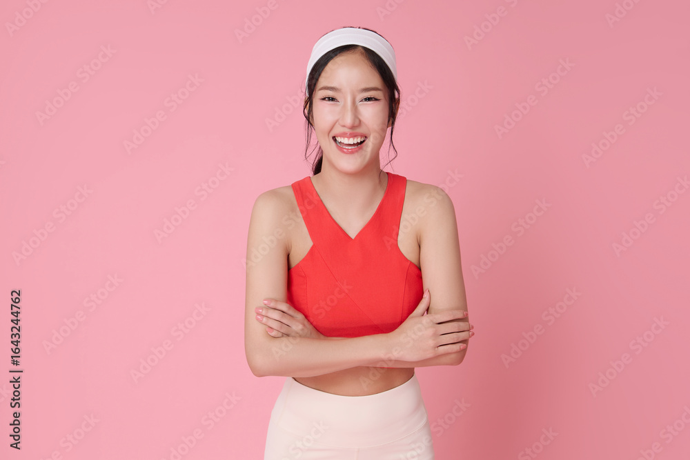 Fitness woman on pink background in red sports top smiling with arms crossed for wellness active lifestyle athleisure advertising and healthy gym marketing with copy space