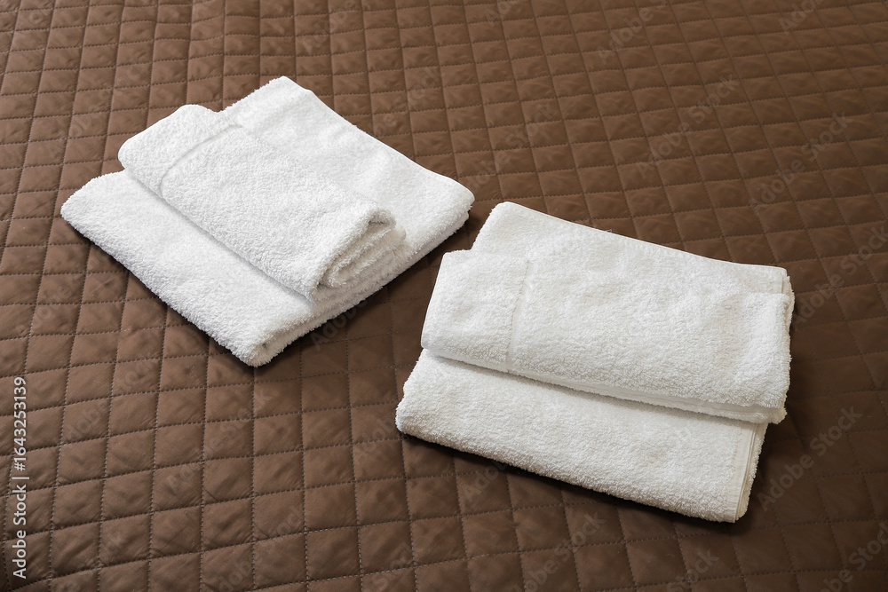 Two white towels close-up on the bed