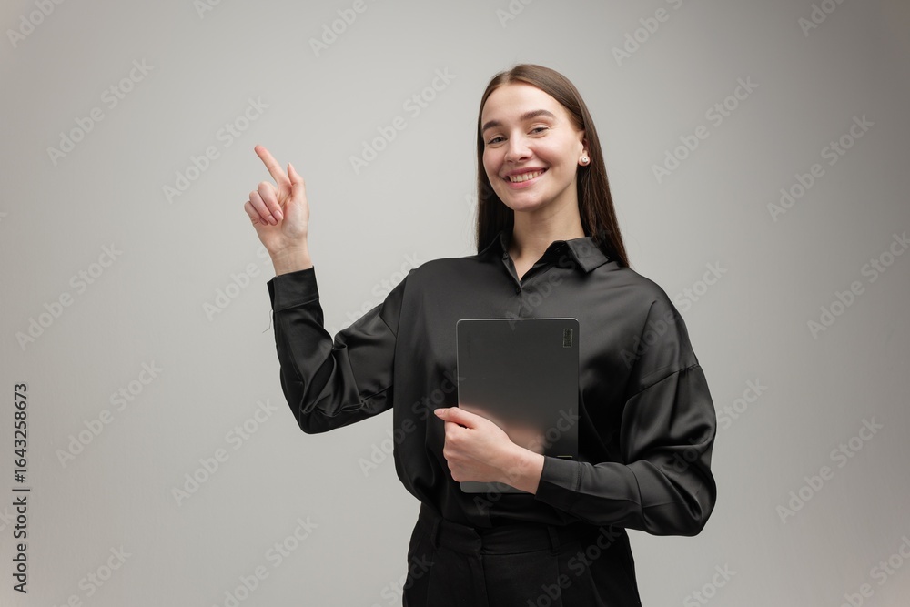 Engaging young woman in stylish black attire promotes an innovative idea with enthusiasm and creativity