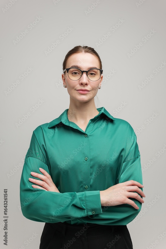 Confident professional in a green blouse poses with arms crossed against a neutral backdrop