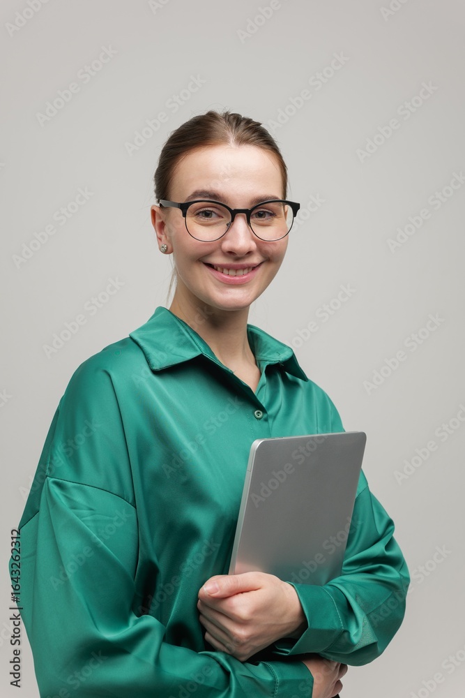 Smiling young woman in green shirt holds a laptop while showcasing confidence and positivity in a modern workspace