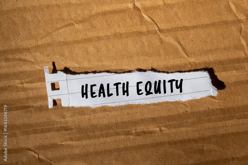 Health Equity message written on ripped torn lined paper on cardboard paper background. Conceptual Health Equity symbol. Copy space.