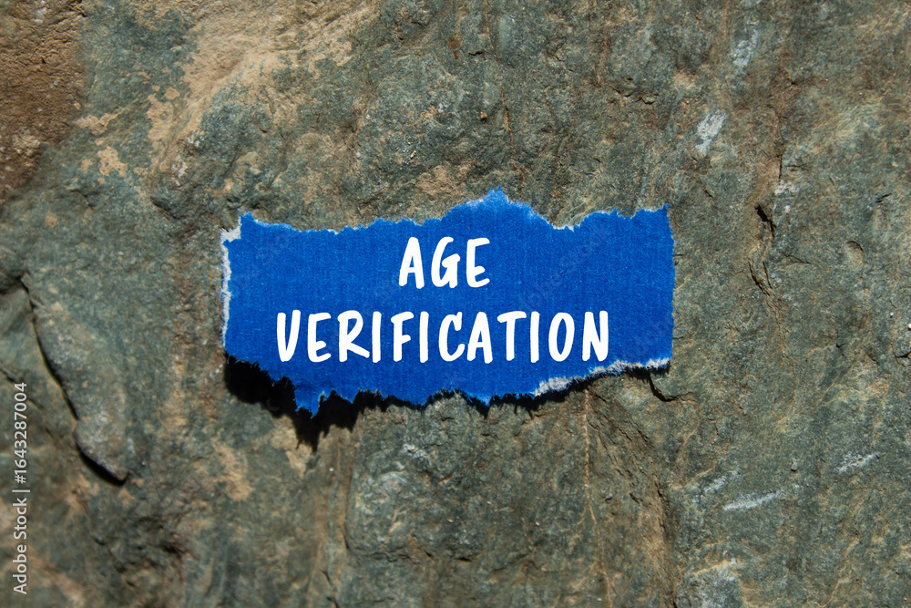 Age Verification message written on ripped torn blue paper on stone background. Conceptual Age Verification symbol. Copy space.