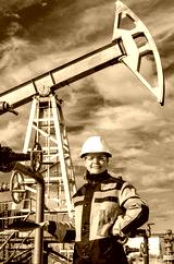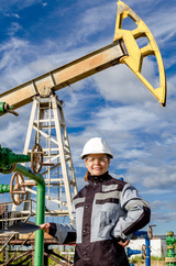 Woman engineer near pump jack wearing white helmet and work clothes. Industrial site background. Oil and gas concept.
