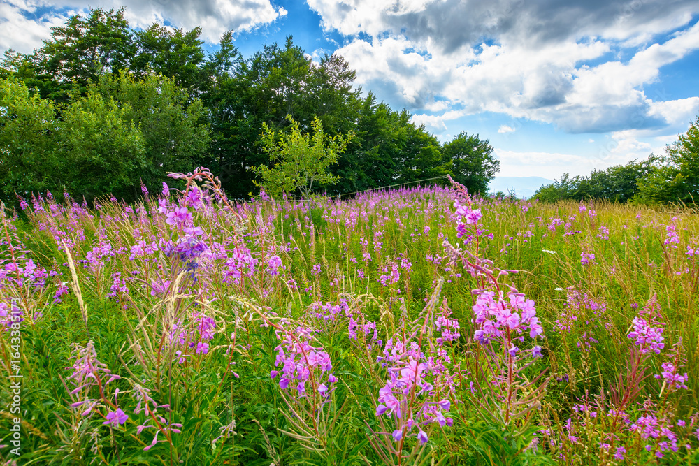pink fireweed flower in nature. natural flora of carpathians in summer. willowherb plant blooming on the alpine meadow in front of a forest background
