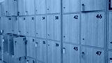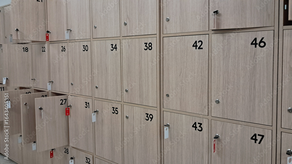 Numbered wooden lockers with open doors and key tags in a public storage area