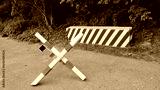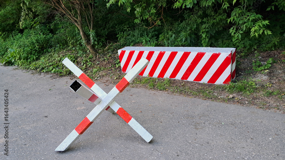 Red and white road barrier and metal barricade blocking path in park