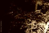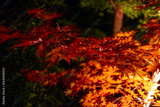 Bright red and orange leaves of Japanese maple branch glowing under artificial night lighting with blurred natural background and shallow focus