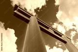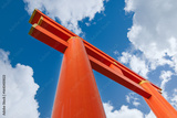 Heian-Jingu Shrine torii gate in Kyoto photographed from below against a bright blue sky with white clouds in Higashiyama Ward