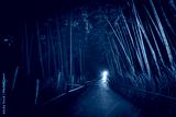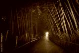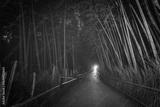 Before sunrise in Kyoto, distant headlamp illuminates the bamboo path in Arashiyama, revealing deep shadows and warm tones in style of vintage film photo