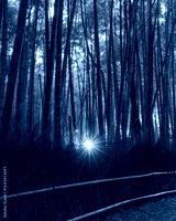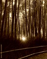 Vertical photo from Arashiyama Bamboo Grove in Kyoto, Japan captures the rare moment when morning sun pierces the trunks, forming a sharp starburst