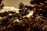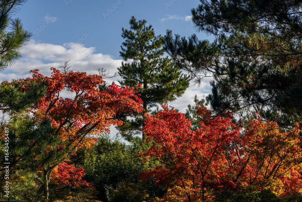 Brilliant red maple leaves glow among evergreen pine trees in Japanese forest, capturing the seasonal contrast of autumn foliage against deep green needles