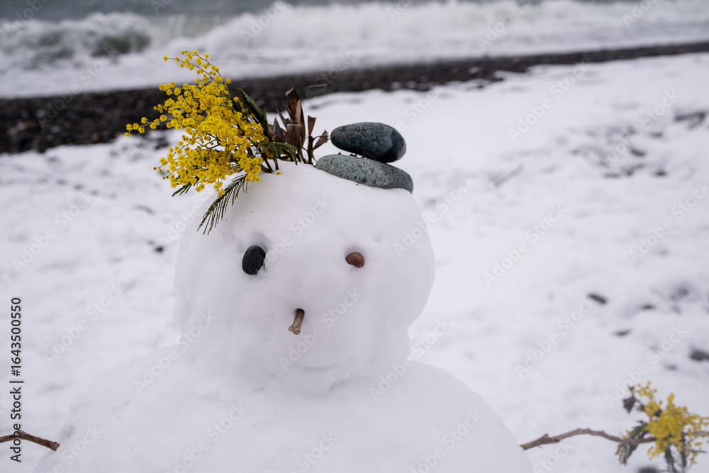Cute snowman decorated with yellow mimosa flowers against the blue sea on a snowy beach in winter. Holiday background with cute snowman. Christmas card