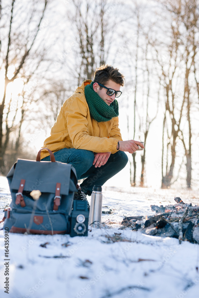 Man on mountain relaxing at campfire. Man warming his hands at winterday on his way to explore the mountains.
