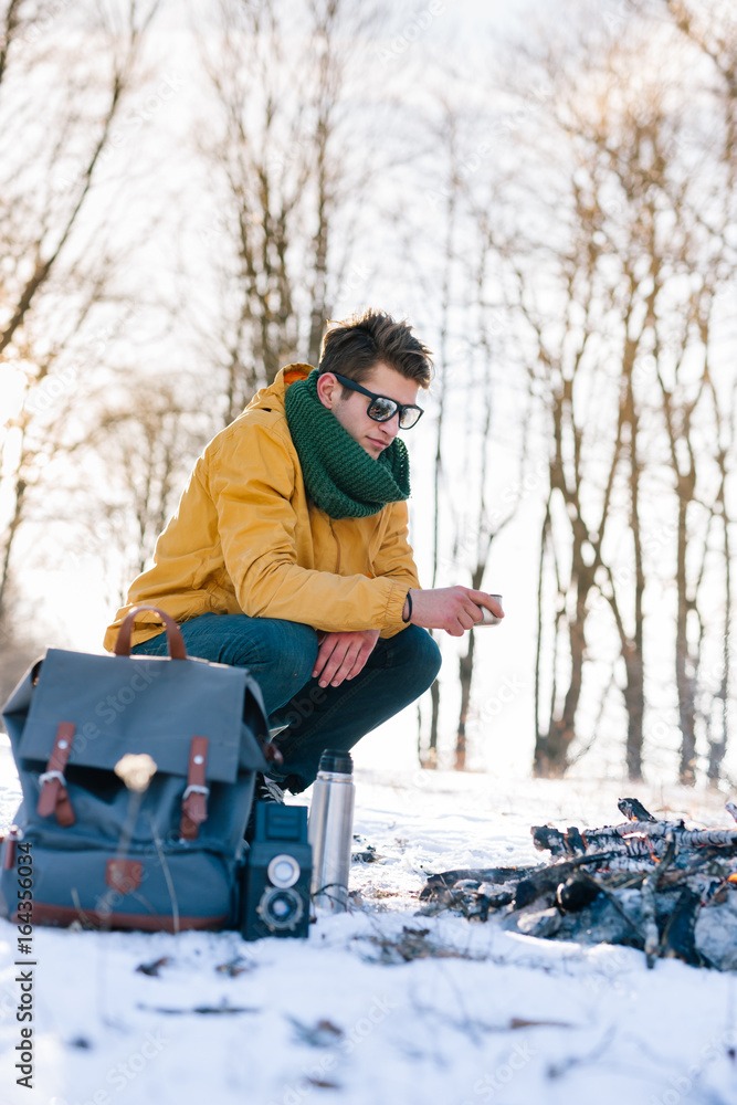 Young guy in the woods exploring nature in winter time, individuality and freedom concept