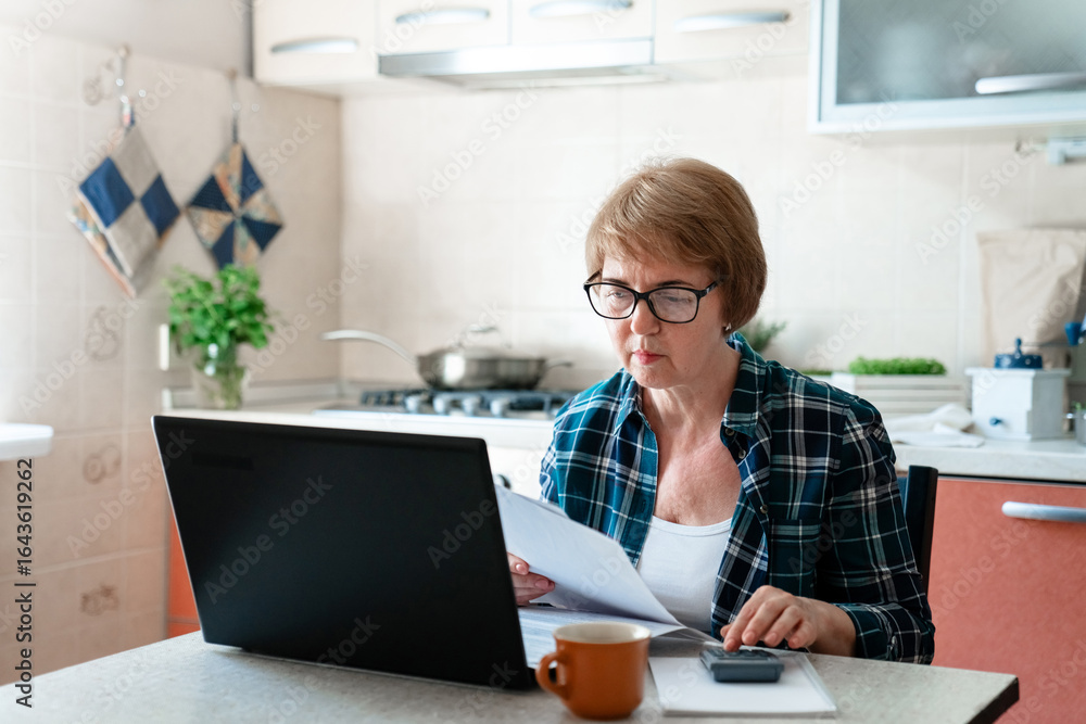Senior woman working from home with laptop, finances, paying utility bills on kitchen. Personal budgeting, financial literacy, retirement savings, pension. Stress, money anxiety. Lifestyle moment