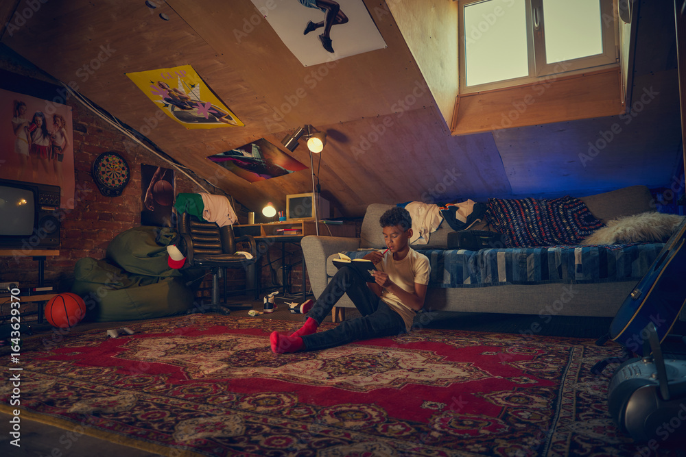 Teen boy reading notebook in retro attic bedroom. Concept of education, creativity, personal space, and emotional growth with nostalgic 90s room decor.