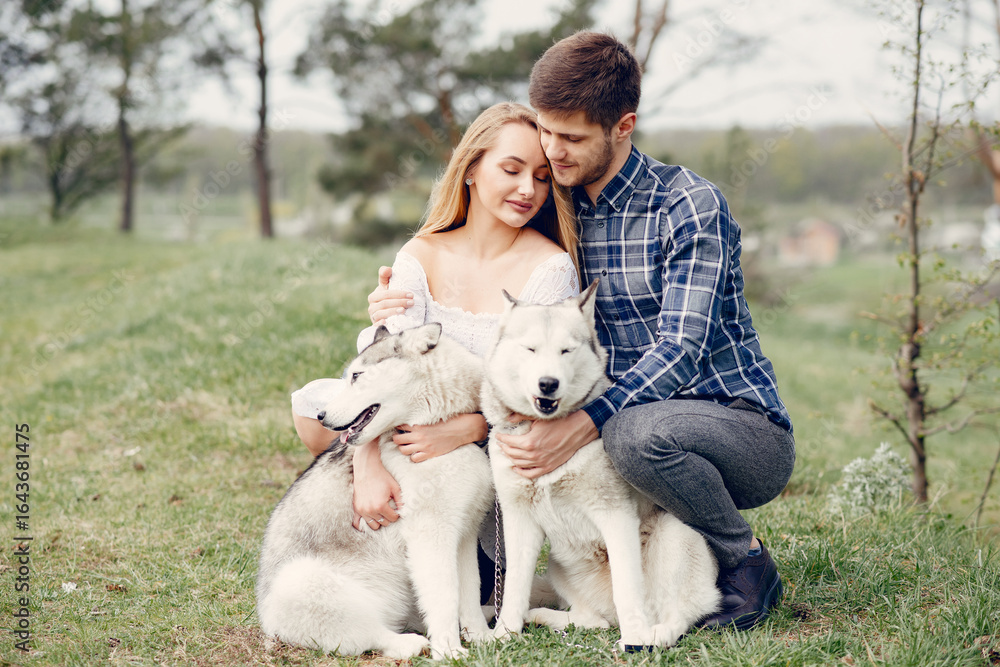 Beautiful couple in a summer forest with a dogs