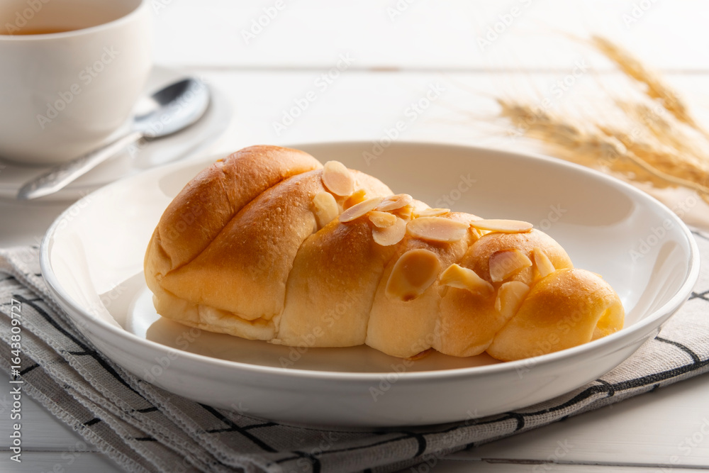 Cream Horn Bread.pastry horn with cream filling and topped with sliced almonds in white plate.