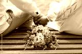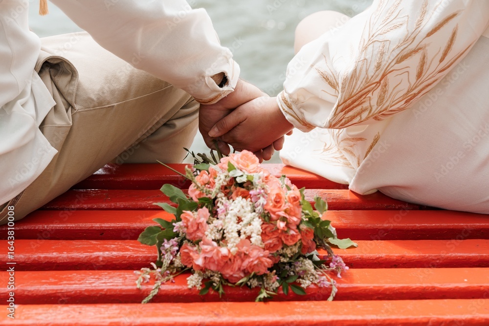 Romantic Wedding Ceremony Hands Holding Bouquet on Red Boat Lake Shore, Traditional Ukrainian Style Embroidery, Warm Pastel Colors.