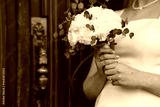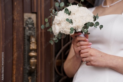 Elegant Bride Holding White Hydrangea Bouquet with Eucalyptus, Wedding Photography, Rich Brown Door, Soft Focus, Romantic Style.