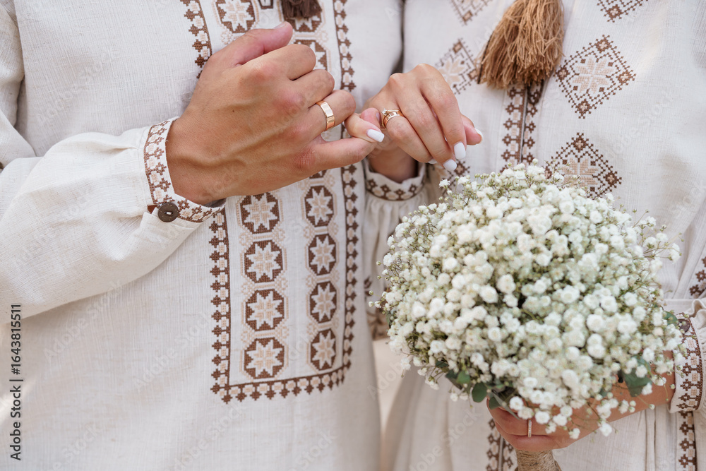 Traditional Ukrainian Wedding Ceremony: Couple's Hands with Rings and Bouquet, Embroidered Shirts, White Flowers, Cultural Celebration, Rustic Style