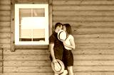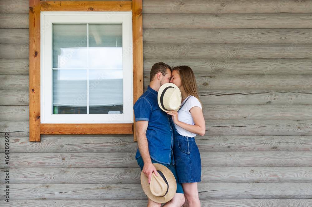 Man and woman standing at home with a large wooden window, the event concept of a young family,