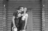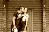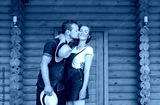 Man and woman standing at home with a large wooden window, the event concept of a young family,