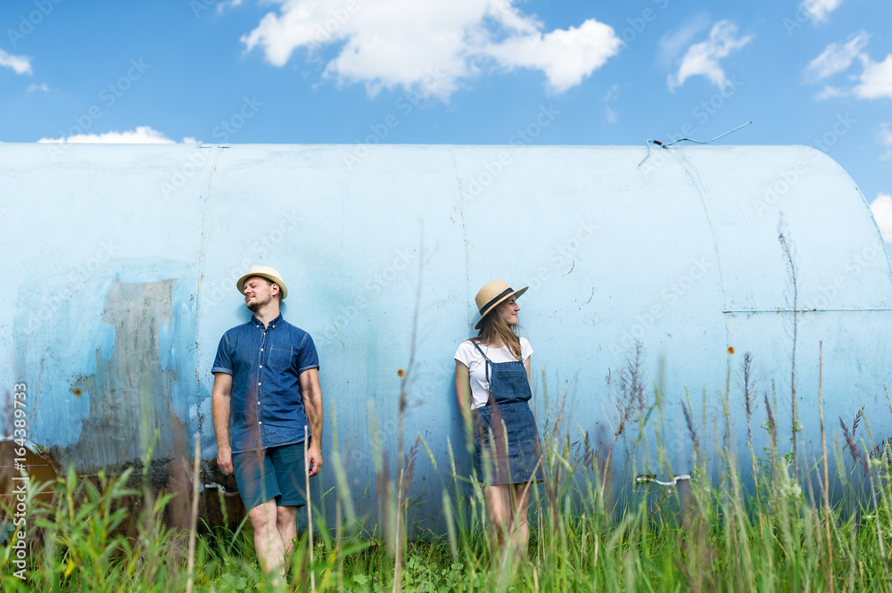 Hipster couple hiding faces behind a hats. Playing outdoors on a beautiful sunny summer day