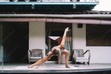 Full body twist pose in dynamic yoga session, woman extends upward with control and elegance. Concept of strength, posture, and presence in balance with focused physical expression.