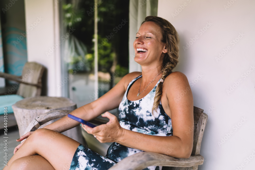 Mature activewear-clad woman focused on phone while seated, embodying calm tech interaction, solo mindfulness and autonomy in connected wellness lifestyle.