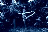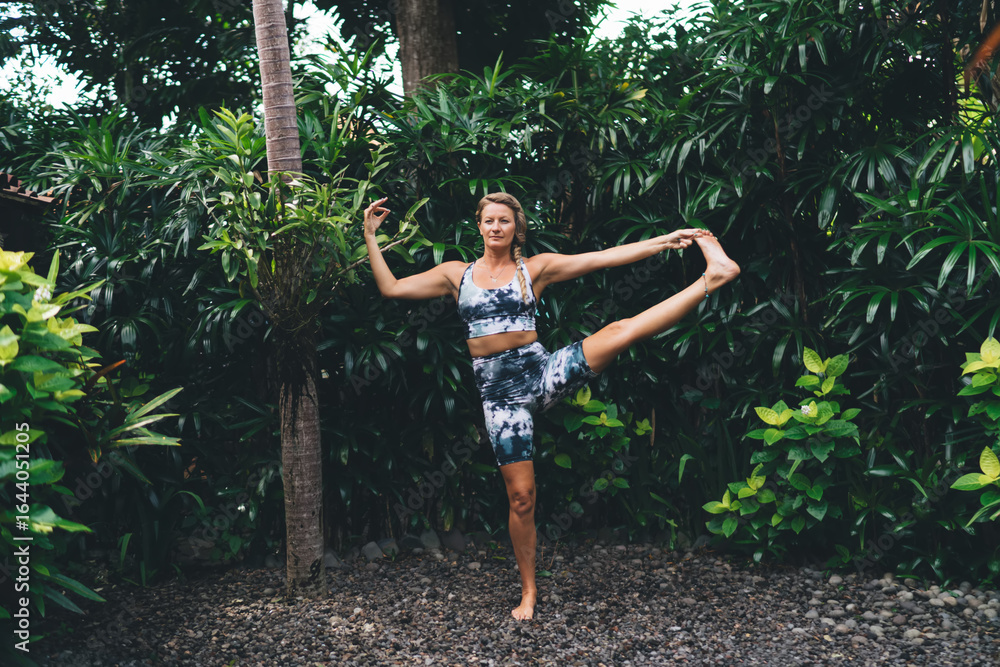 Fit mature woman practicing yoga outdoors, showcasing strength, balance and digital wellness mindset. Perfect symbol of body-tech harmony and empowered lifestyle.
