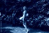 Woman with yoga mat walking barefoot near statue, evoking symbolism of balance, inner growth and retreat from digital overload in hybrid tech-aware lifestyle.
