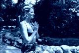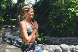 Peaceful woman in prayer gesture embodies digital surrender and mindful appreciation of stillness, reflecting harmony between body, spirit and modern tech boundaries.