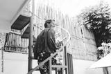 Smiling female entrepreneur with tech planner climbs stairs, reflecting positive energy, modern career growth and mobile-first approach to managing remote projects.