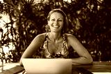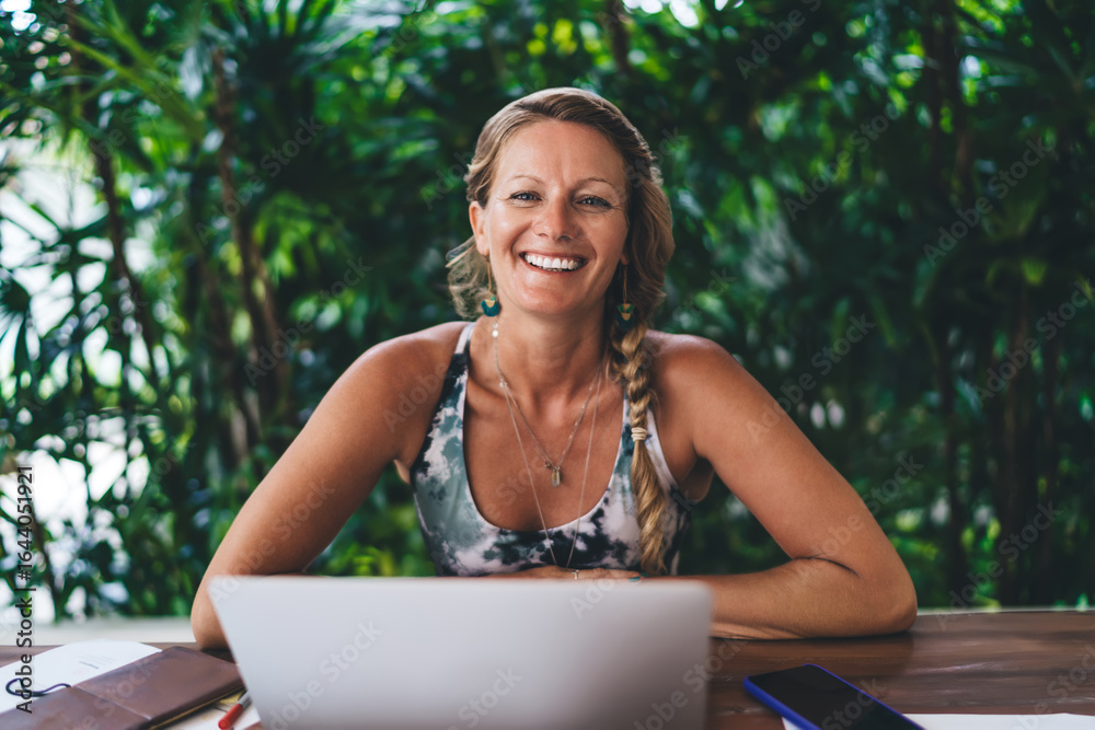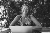 Cheerful woman smiling at camera behind laptop at tropical desk, embodying energy, balance and empowerment in digitally enabled independent professional lifestyle.
