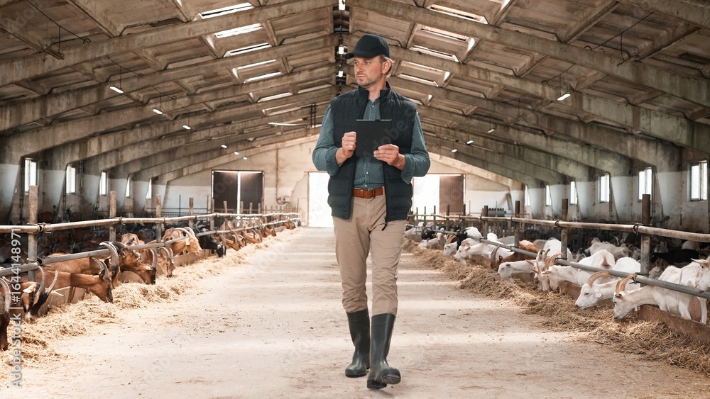 Caucasian handsome middle-aged male walking in barn typing on tablet device browsing online. Cattle in shed. Man farmer using gadget indoors in domestic farming. Animal farm with goats herd in stable