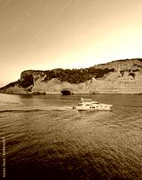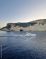 Vibrant evening seascape with a boat cruising away on the blue sea, near the Pirate Cave in Kemer at sunset. Beautiful Turkish mediterranean coastline lined with tree covered rocky cliffs at dusk