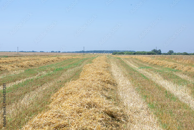 Freshly mown wheat hay lies in a row across the field after the harvester.