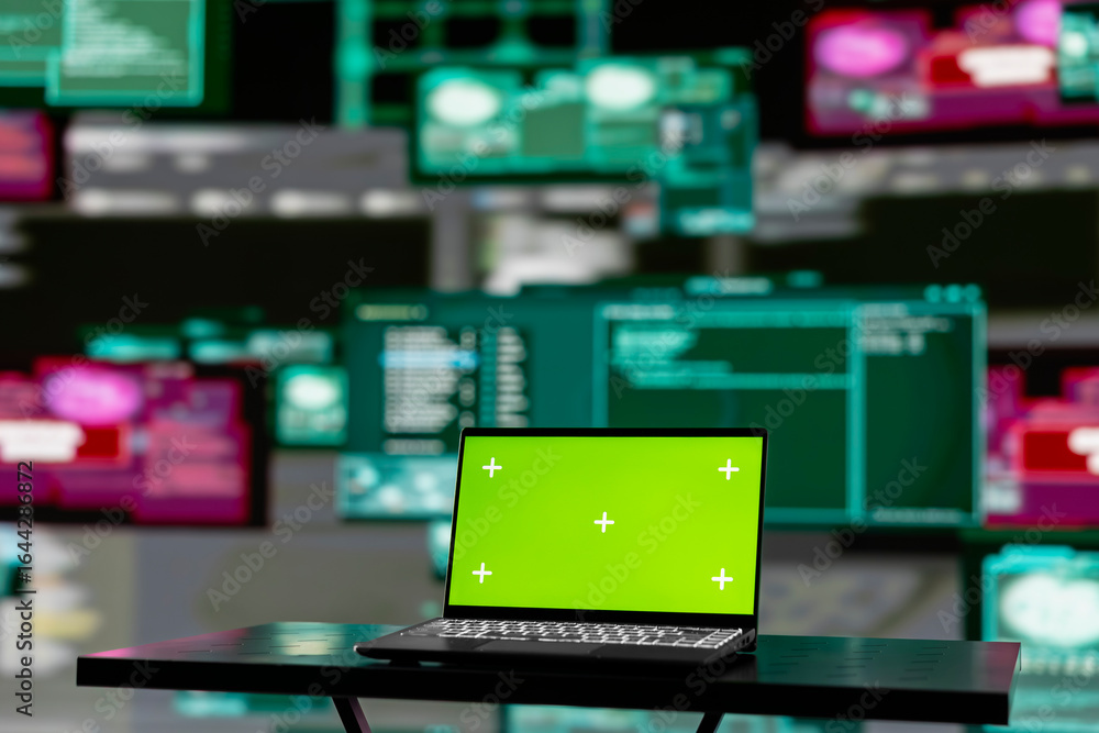 Empty scene with green screen on laptop showcases quantum threat on the dark web, space for a cyber crime with system override and identity theft. Cracking passwords to steal data.