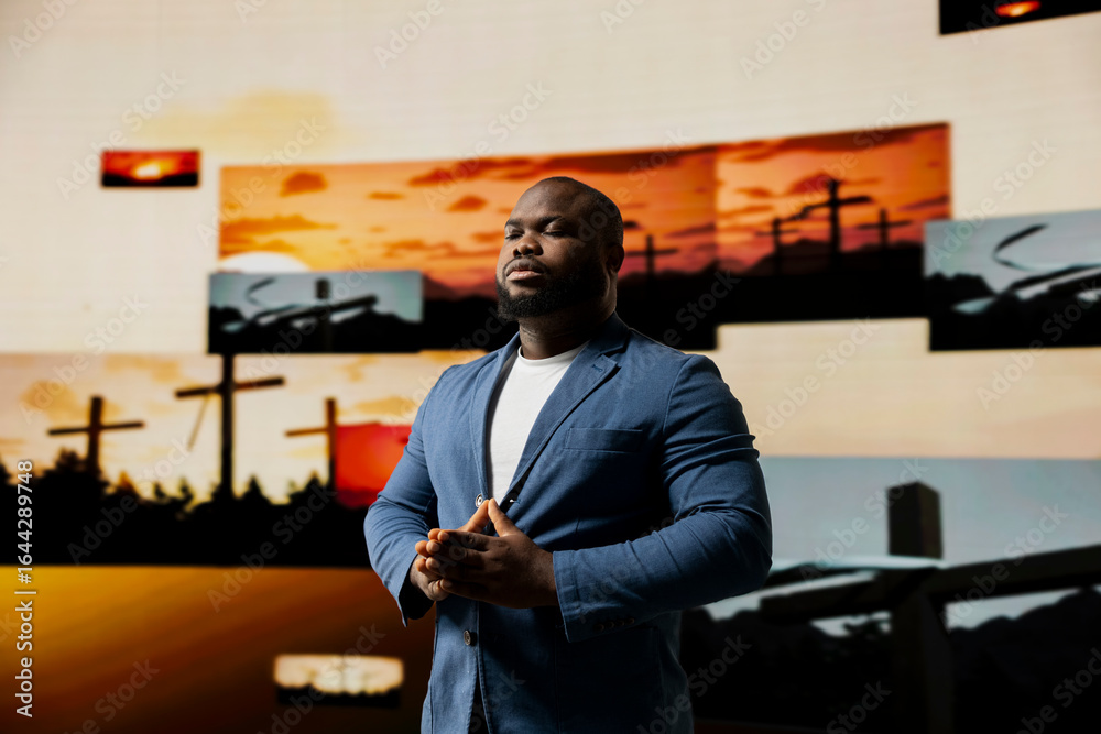 African american man does meditation pose with hands together in prayer, radiating inner peace and spiritual devotion. Surrounded by images of the cross, he reflects serenity and divine connection.