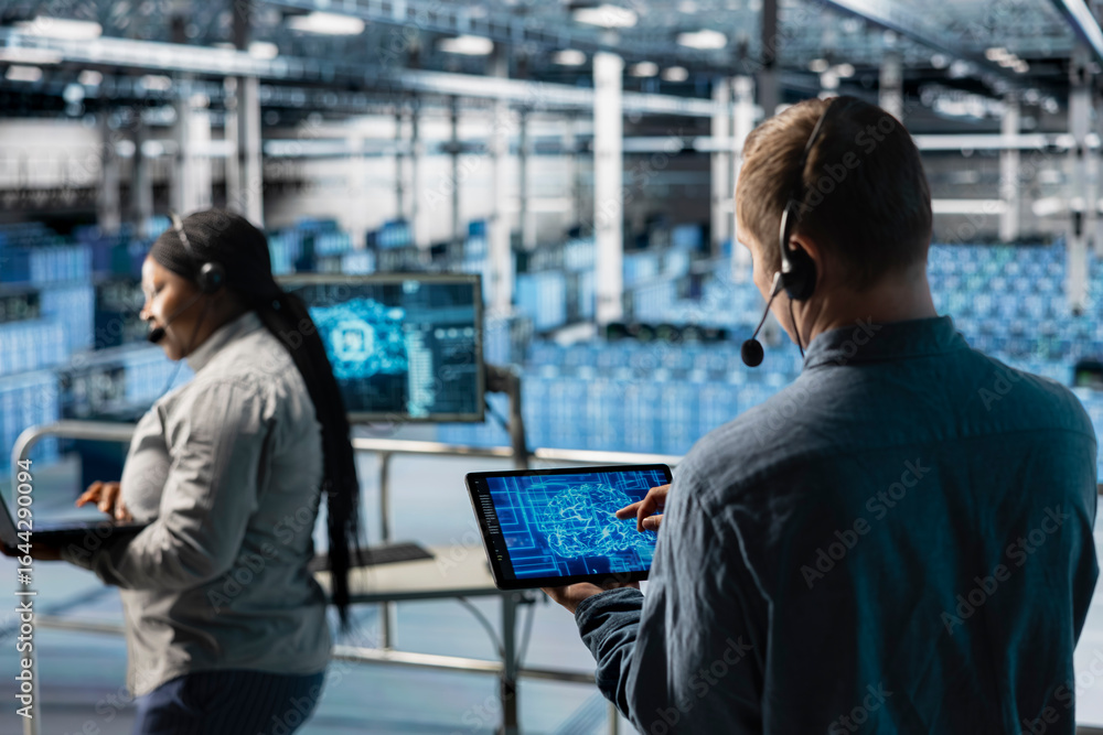 Man in server farm using artificial intelligence tech on device, talking in headset mic. Close up of data center operator using tablet, assisting customers with AI enhanced troubleshooting