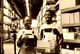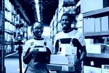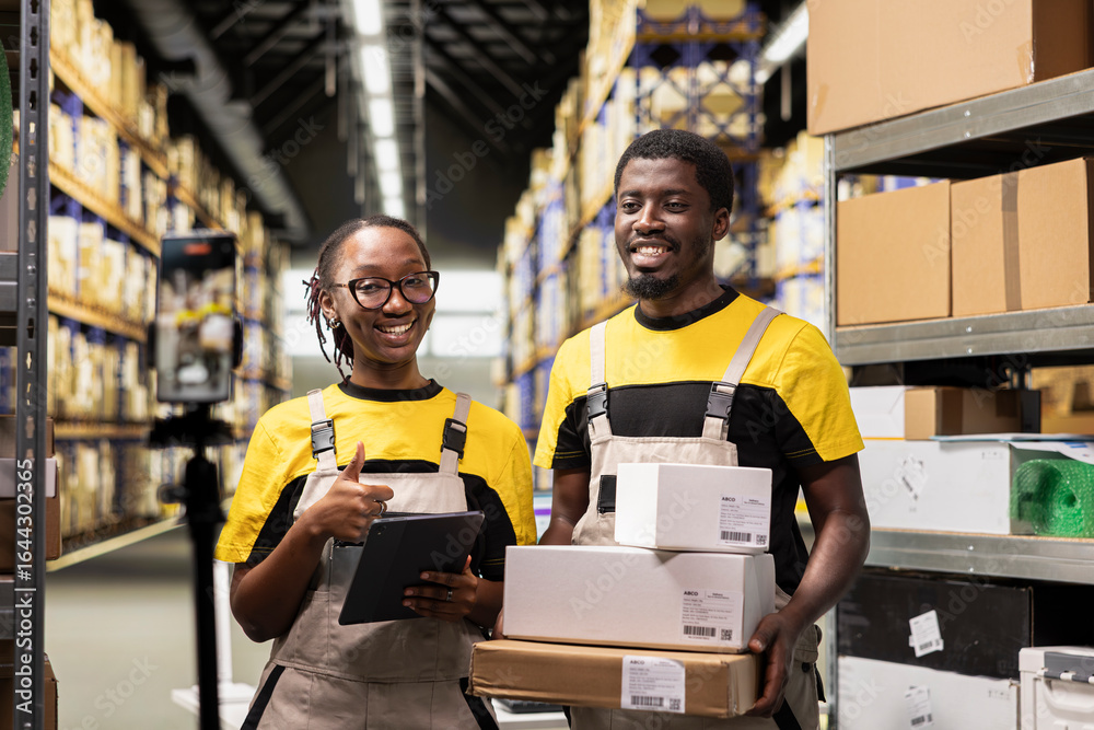 African American workers collaborating on a video marketing campaign in a storage room, fulfillment center retail operations. Coworkers live streaming vlog as commercial for large business.