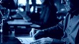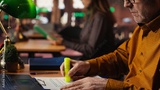 Elderly student using highlighter pen to memorize lesson papers, applying a study strategy with essential information from courses. Old man works on memorization for exams.