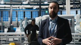 Business owner and visionary speaker presents a clean energy strategy at solar plant for production line, sharing insight on business to create sustainable solutions, startup growth. Camera A.