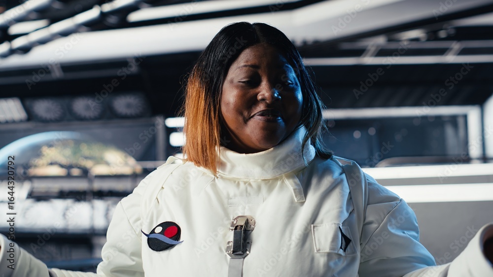 Jolly astronaut waves hand during videocall with Earth command center, documenting results from space experiments. Cosmonaut salutes ground center team, sharing research observations
