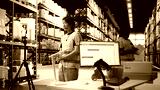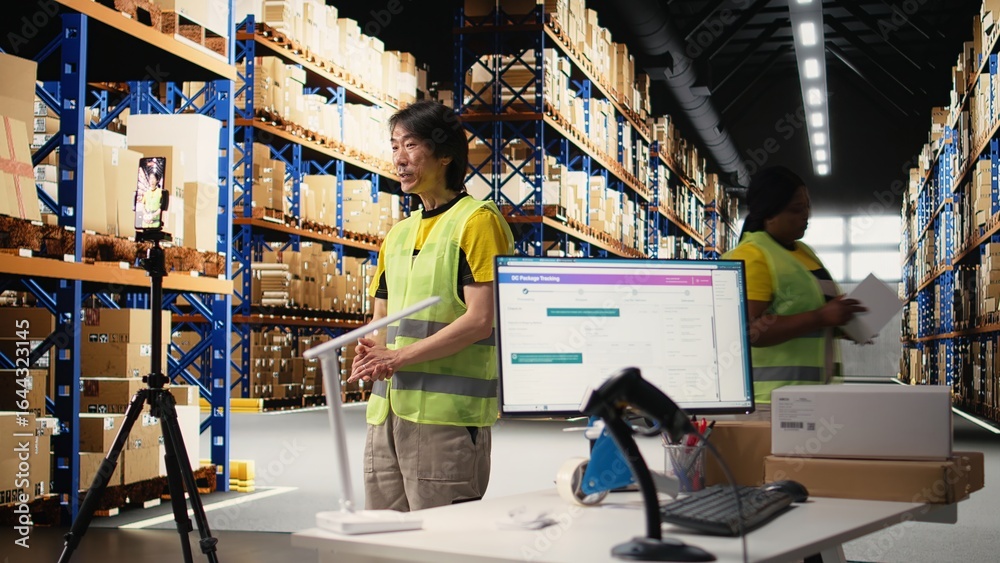Asian man advertising the large business supply room activity on a video, broadcasting a vlog for online shopping delivery advertisement. Man presenting the cargo on promotional ad. Camera A.