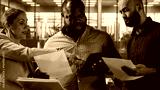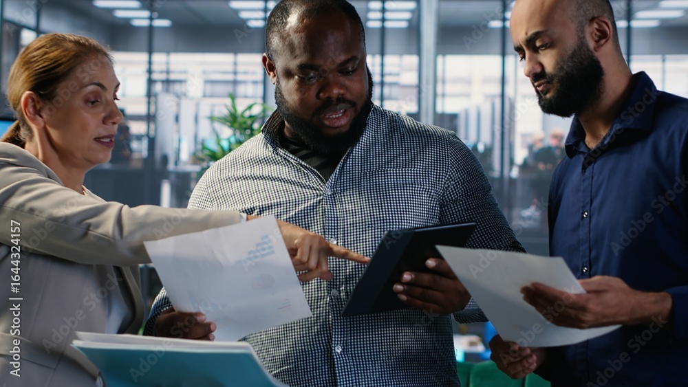 Diverse team of associates engaging in decision making and corporate leadership activities with a focus on foresight and negotiation. Multicultural business development. Camera B.